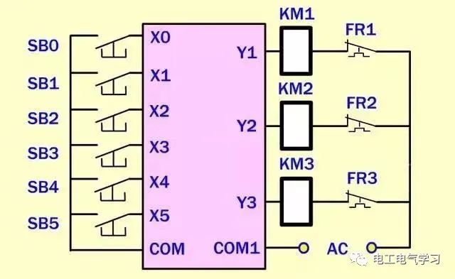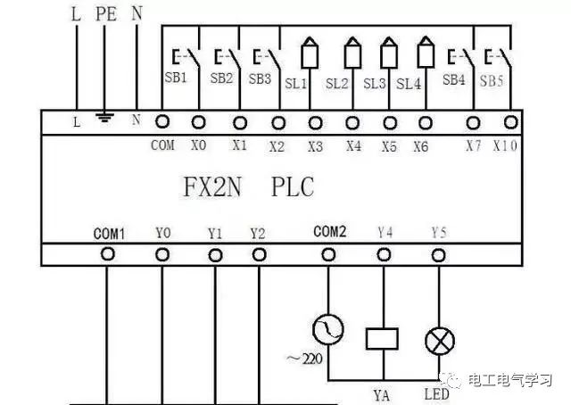 按钮或者接近开关的接线所示:PLC开关量接线,一头接入PLC的输入端(X0,X1,X2等),另一头并在一起接入PLC公共端口(COM端)。