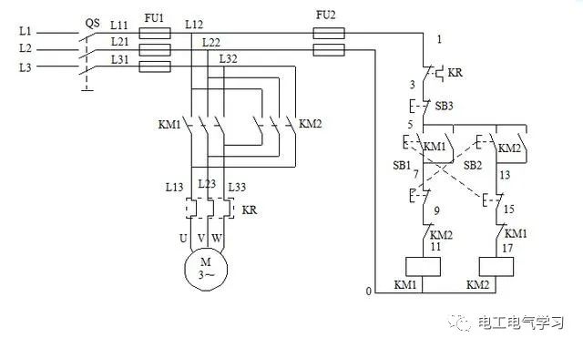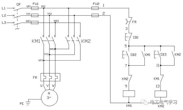 要提互锁不得不提三相电机正反转,三相电机正反转电路是电工基础中最常用最基本的电路,我们作为维修维护人员对于这个电路要熟记于心,因为这个电路中有很多值得我们学习的。