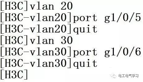 接下来将交换机的接口加入到相应的VLAN中,将g1/0/5加入到VLAN20,将g1/0/6加入到VLAN 30 。