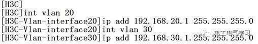最后再设置VLAN的接口IP地址,VLAN 20设置为192.168.20.1/24,VLAN 30设置为192.168.30.1/24 。