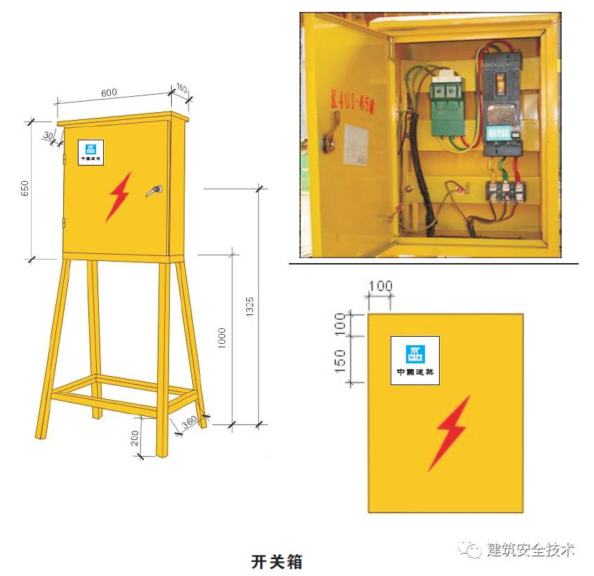 3. 开关箱漏电保护器的额定漏电动作电流不应大于30mA,额定漏电动作时间不应大于0.1S;使用于潮湿或有腐蚀介质场所的漏电保护器,其额定漏电动作电流不应大于15 mA, 额定漏电动作时间不应大于0.1S;配电箱支架应采用L40×40×4角钢焊制,箱体颜色为中黄(做喷塑处理)、CI及闪电标示、尺寸规格如图所示。